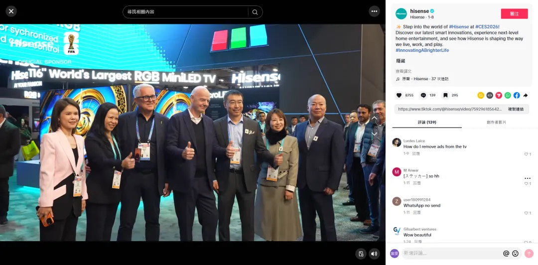 一边是TikTok流量突围:手握190万粉丝的海信TikTok官号,发布“科技星球”概念预热视频,没有生硬的产品硬广,只传递一个核心:用技术,让日常更健康、更快乐,让生活更有光,并向全球观众发出邀请,共赴CES解锁未来科技。直接斩获101.7k点赞、3370万次播放。