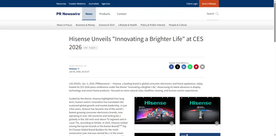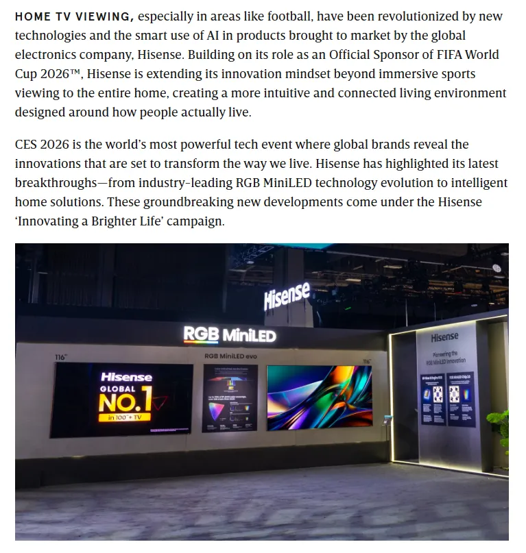 如果说体育营销,是海信敲开全球市场的“破圈利器”,那么2026年CES展会,就是海信亮出硬核实力、联动全球发声,真正实现品牌升维的关键一战。