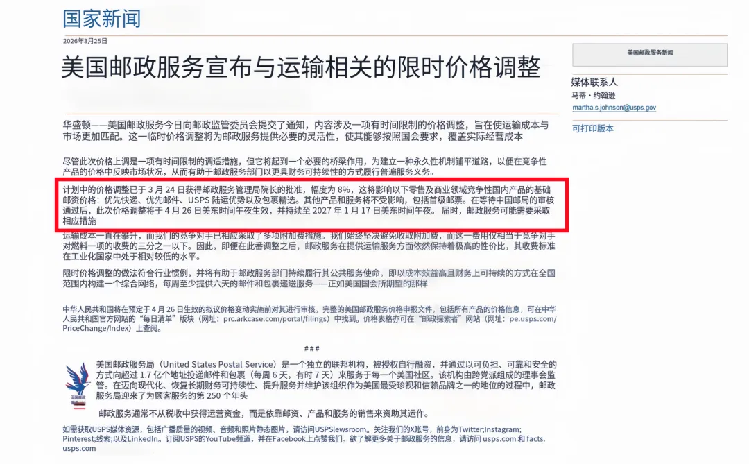 最新消息显示,USPS已于2026年3月25日正式向邮政监管委员会提交调价申请,计划自2026年4月26日起加收8%的临时运输附加费。此举或将重塑美国物流市场价格体系,跨境卖家利润空间面临进一步压缩。