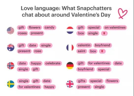 Snapchat分享了在美国、澳大利亚、挪威等8个国家的人们在Snapchat上最关注的话题和关键词。除了常见的“gift”和“rose”之外,“single”(单身)这一关键词也出现在了多个国家人们关注的话题之中。这也给品牌提供了一种情人节营销的新角度——除了关注那些你侬我侬的情侣,也可以关怀那些单身的朋友。