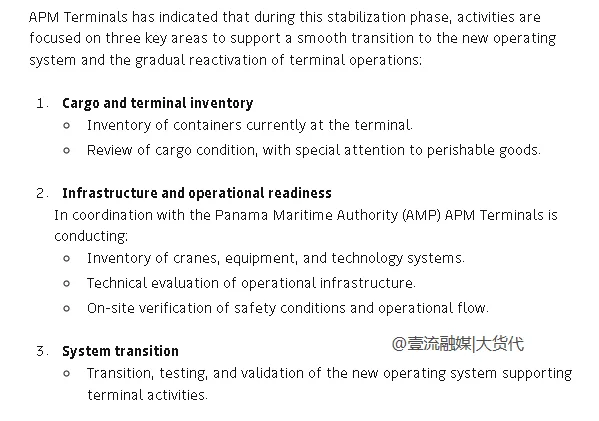 APM Terminals称,当前的目标旨在保障巴拿马物流枢纽的持续运营,同时部署新的码头操作系统,并逐步恢复运营,尽可能减少中断。
