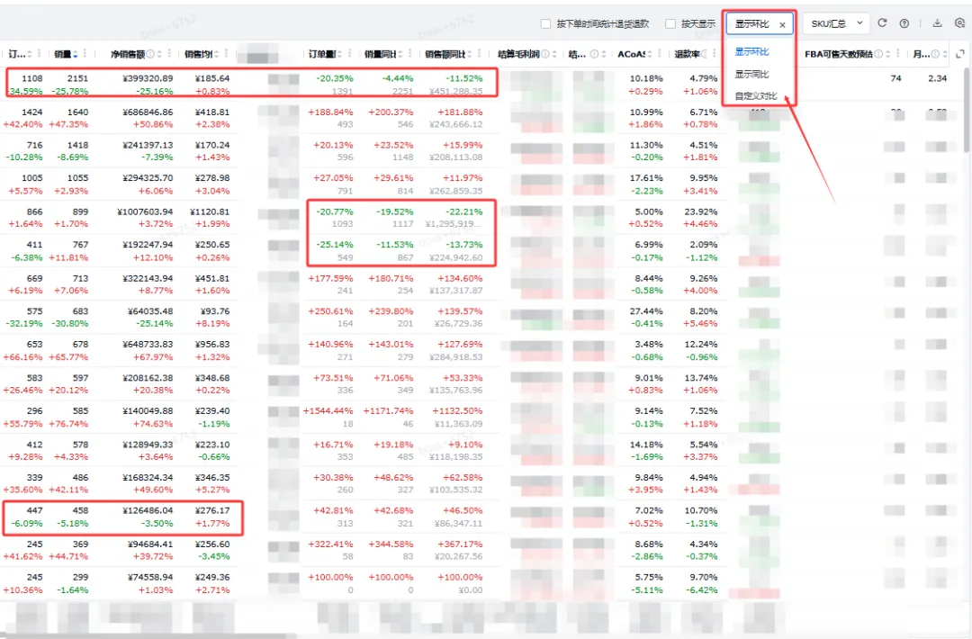 比如说我们假期的数据,我一般会默认显示同比,然后在勾选显示环比(有时候也可以自己选择想要对比的信息),通常情况下我们会优先看下滑的产品,先定位到下滑产品。就比如说第一个,同环比都下降了,那我们会转到ASIN360里面再去查看她的细节数据