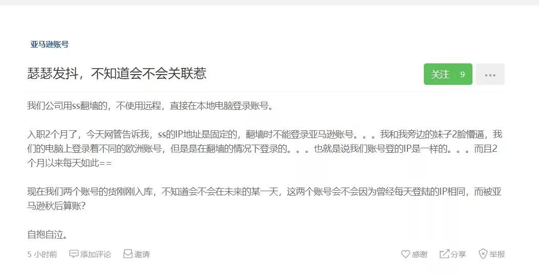 常常有卖家问,我这样操作会不会被关联?今天雨果菌刚好看到这样一个帖子:公司用ss翻墙,且IP地址是固定的。不使用远程,直接在本地电脑登录账号。刚入职的俩运营在翻墙的情况下登录着不同的欧洲账号,且2个月来每天如此。现在两个账号的货刚刚入库。