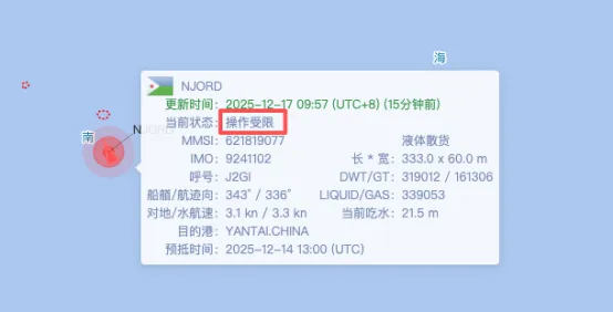 截至目前(12月17号早9时),该船依然处于“操作受限”状态,仍停(漂流)于附近海域。