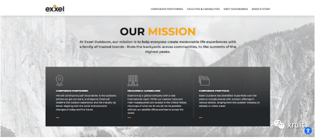 Exxel Outdoors是户外休闲产品的全球供应商。他们的首页立即展示了他们的使命宣言,强调了他们对客户的关注,并试图在他们和用户之间建立快速联系。他们网站的其余部分呼吁人们注意他们的能力、意图和范围,所有这些都有助于使用图像和视频演示。