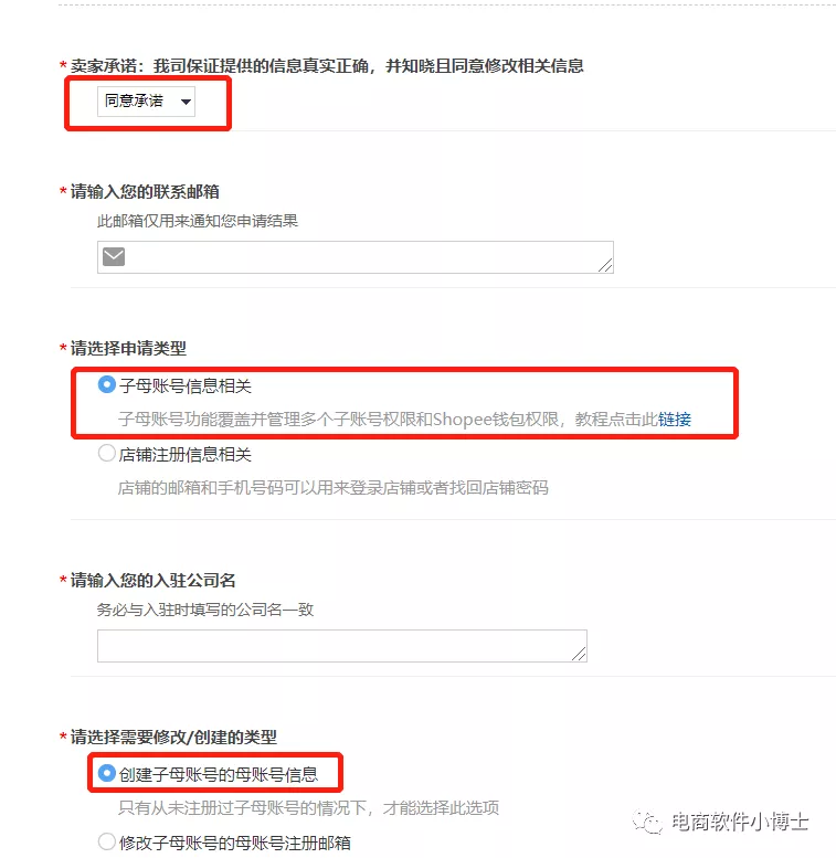 同意承诺→输入邮箱→选择子母账号信息相关→输入完整的入驻公司名称→选择创建子母账号的母账号信息→按照要求上传相关信息
