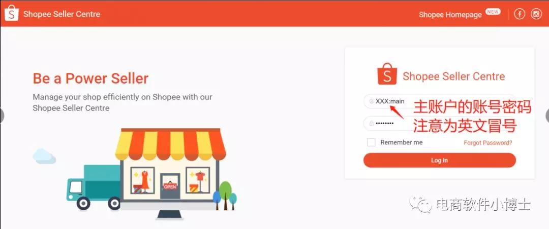 [1]打开对应站点的"shopee卖家中心",使用主账户的用户密码(XXX:main,就是你刚刚用邮件注册成功的那个!不是店铺的账户密码)登录.