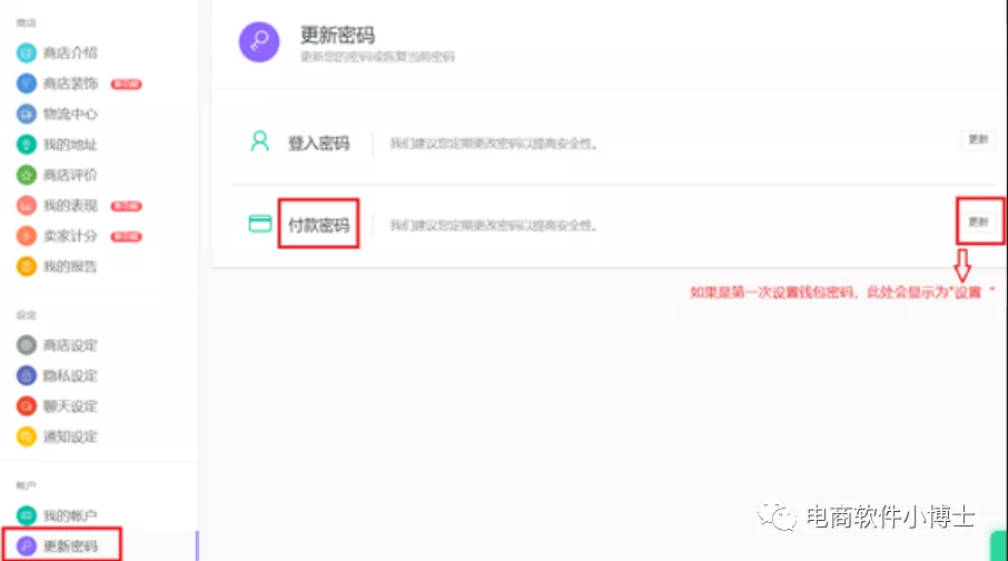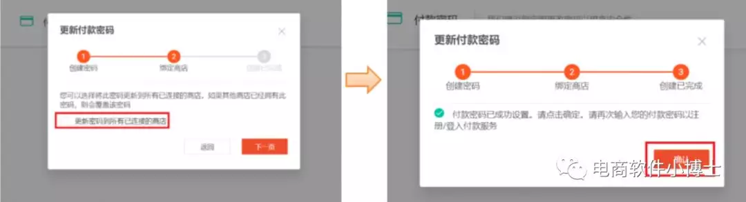 如果主账户绑定了多个店铺,卖家可以选择是否将此新钱包密码同步到同一主账户下的所有其他电偶,最后点击"确认".