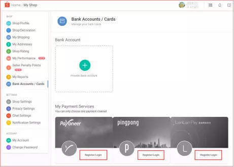 登陆卖家后台中心,点击我的钱包(My Wallet),点击Payoneer、PingPong或者LianLian Pay卡片上的注册/登陆(Register/Login)按钮,页面会跳转至相应官网,卖家根据提示按步骤进行操作即可进行账户申请。