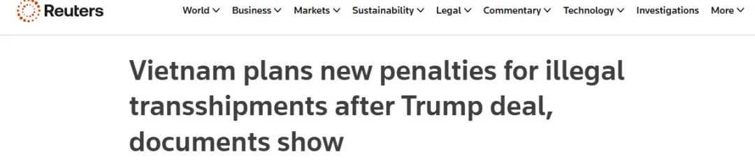 据路透社报道,越南正准备采取更严厉的惩罚措施,打击贸易欺诈和非法转运货物,并将检查重点放在中国产品上,以努力履行对美国的承诺。