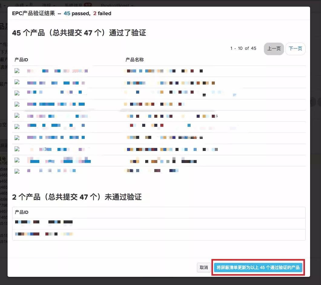 完成产品ID输入后,即可点击页面底部“验证产品”按钮进行产品验证,系统会对产品进行查验并筛选出未通过验证的产品,并弹出验证结果列表,确认后点击产品ID列表下方的“将屏蔽清单更新为以上X个通过验证的产品”完成产品验证及导入。