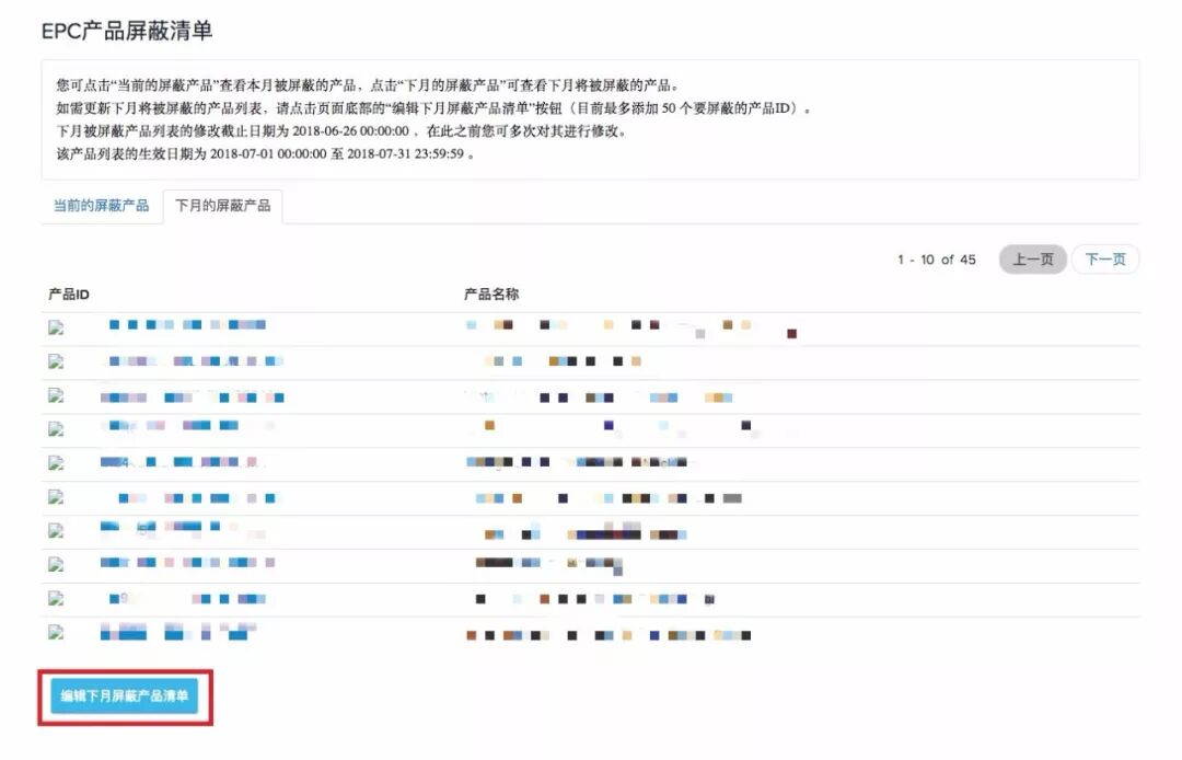 完成导入的产品ID会首先出现在“下月的屏蔽产品”页面中,如果需要对下月屏蔽的产品ID进行移除或者新增,可在每月1日0时至26日0时点击“编辑下月屏蔽产品清单”进行编辑并提交。
