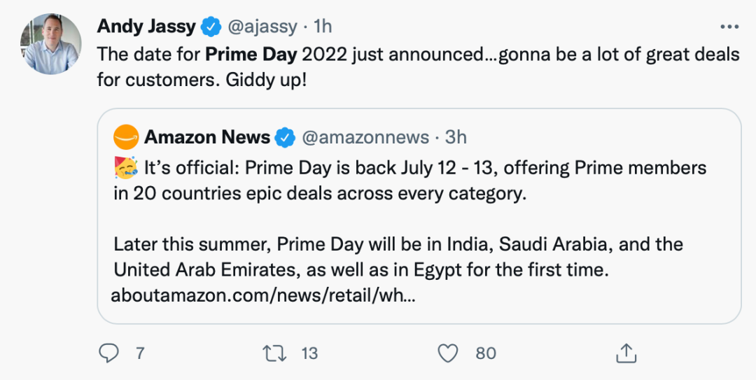 亚马逊CEO安迪贾西亲自站台,在推特上转发今年Prime Day的新闻。