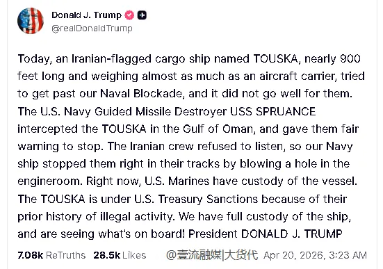 在TOUSKA号轮被强制截停并扣押后,美国总统特朗普也在其社媒平台上宣告了这一次扣船行动,他在推文中说道:“我们的海军舰艇直接在机舱炸开一个洞,使其停止航行....目前,我们已完全控制该船,并正在检查船上物品。”
