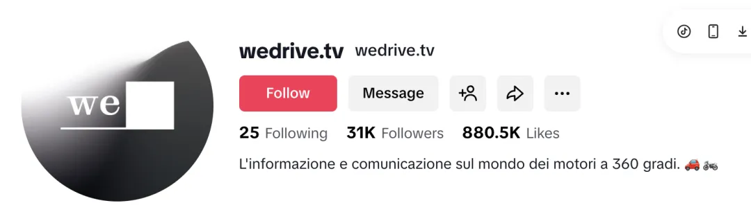 wedrive.tv 是一个专注汽车与摩托车领域的短视频媒体账号,名称本身就带有明显的汽车媒体属性。