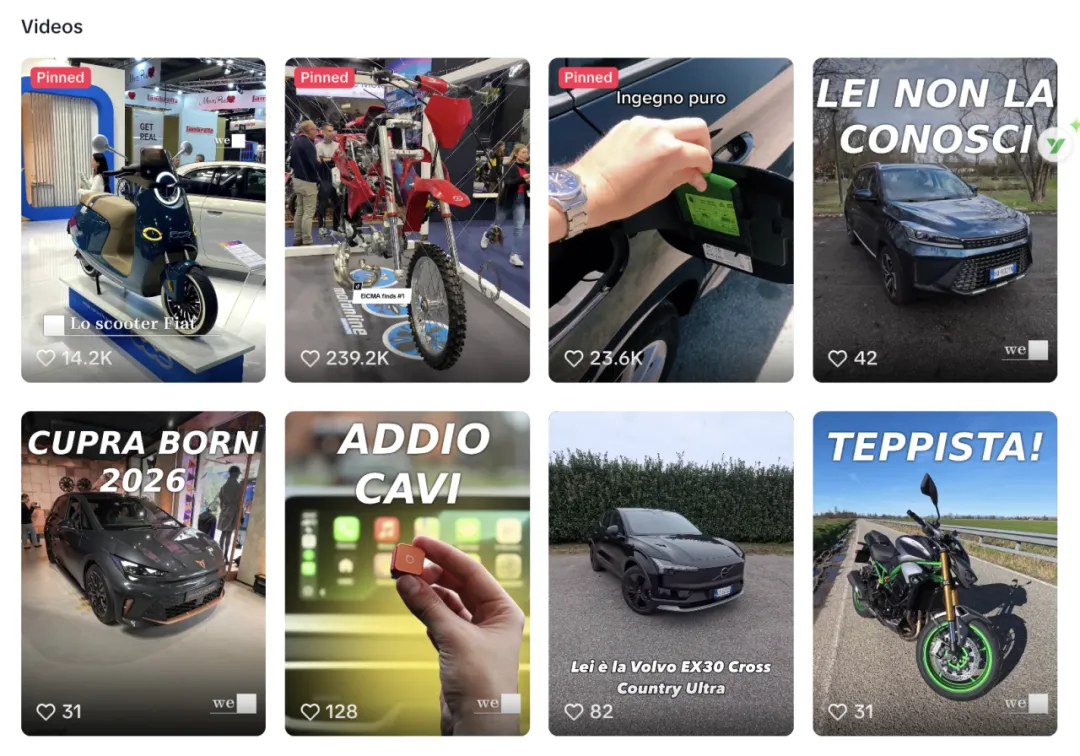 这种内容模式对于品牌出海非常有效。首先,展会本身具有行业权威性,在车展现场出现的品牌更容易获得消费者信任;其次,wedrive.tv 使用意大利语进行讲解,使内容更贴近当地用户习惯;最后,通过现场导览与主观评价结合的方式,让观众能够快速了解产品特点。