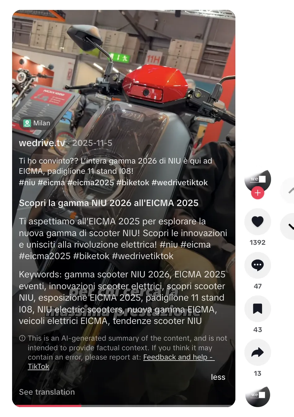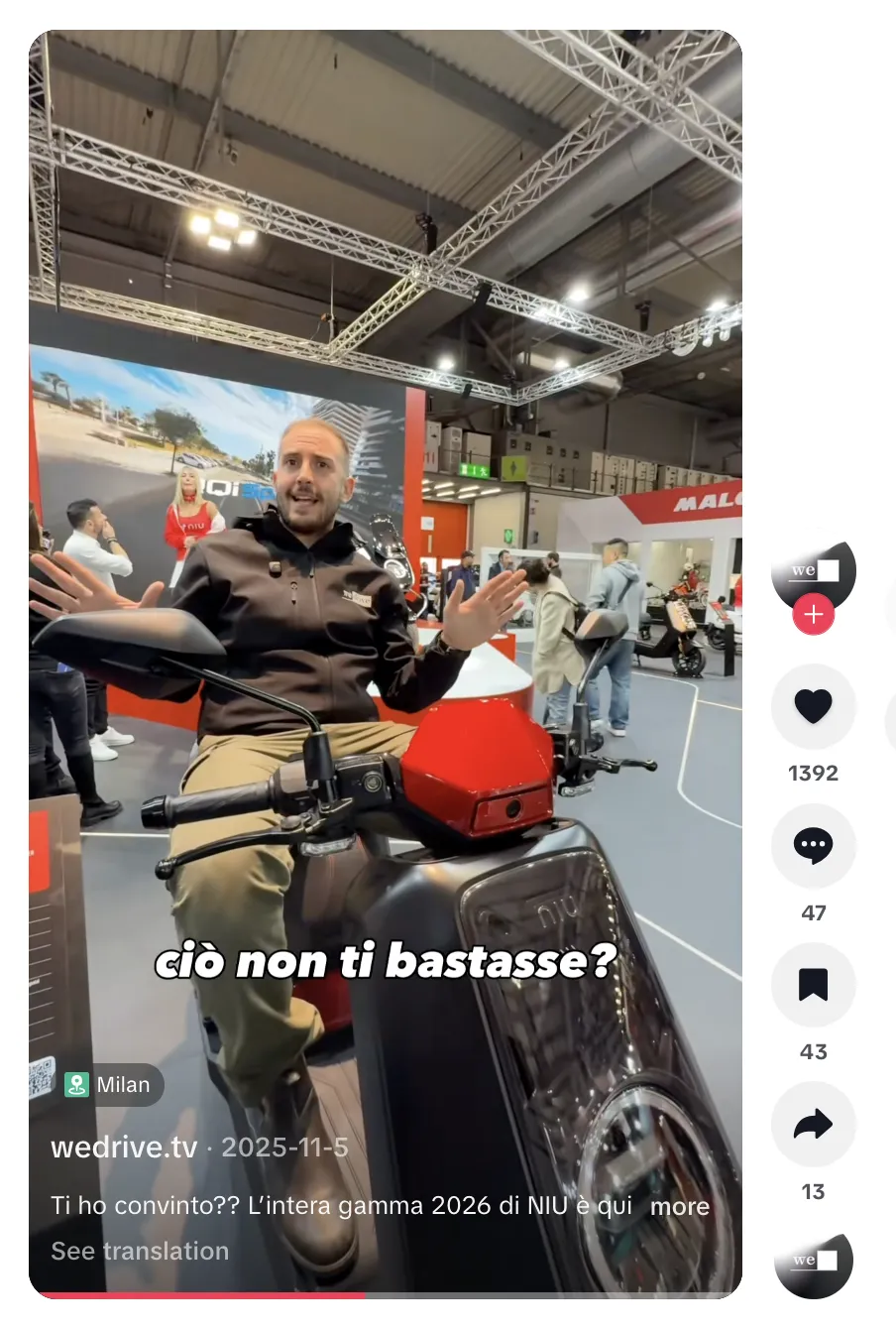 总体来看,wedrive.tv 通过本地语言报道、车展场景展示以及短视频形式传播,为 NIU 在意大利市场带来了有效曝光与讨论度。
