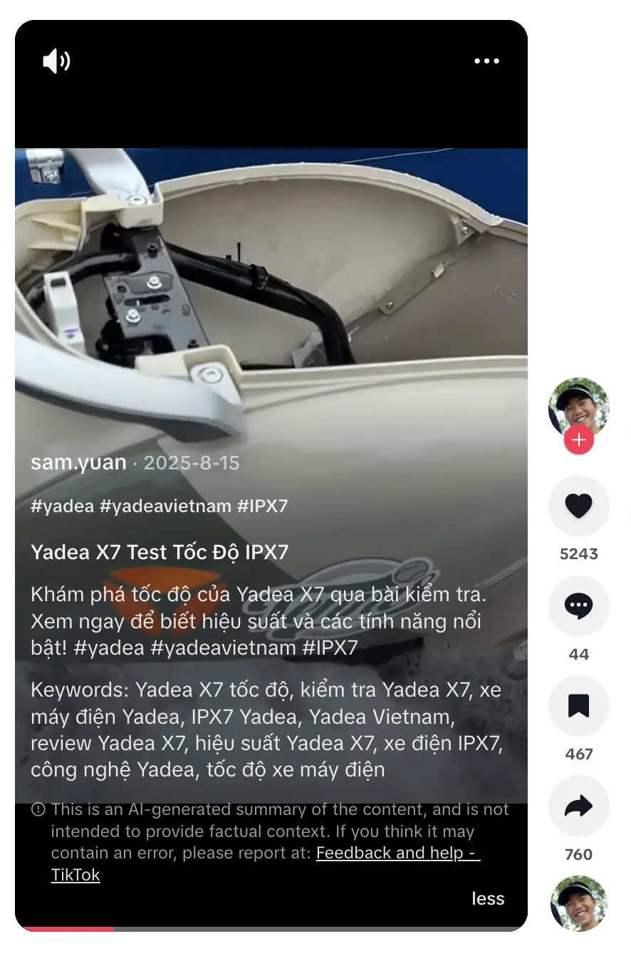 整体来看,sam.yuan 通过真实测试和生活化短视频,为 Yadea 在海外市场尤其是东南亚用户群体中创造了讨论与曝光。
