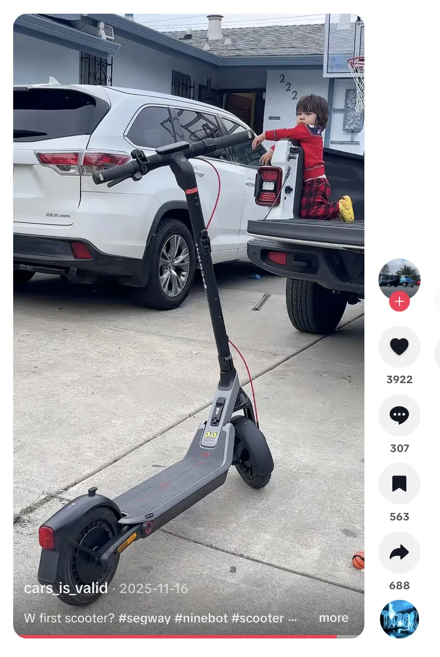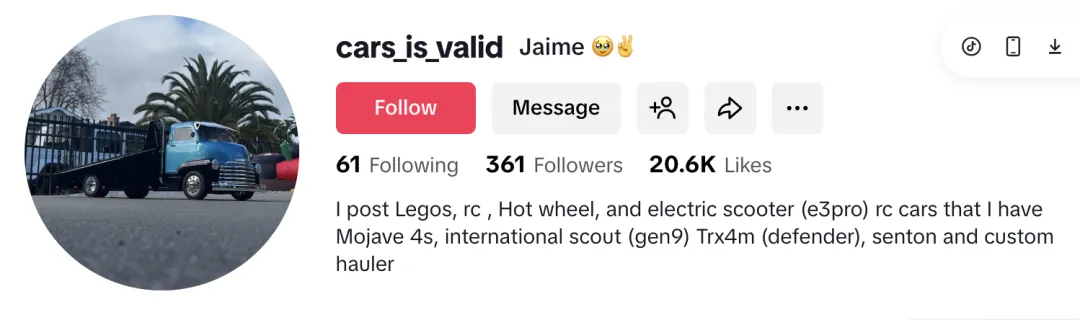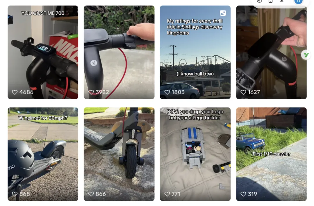 除了生活化创作者与草根测试类内容外,一些更垂直的兴趣型达人也在帮助中国电动出行品牌触达细分圈层。例如 RC 模型与电动滑板车爱好者账号 cars_is_valid,就成为 Segway-Ninebot 在海外社区中建立口碑的重要节点。