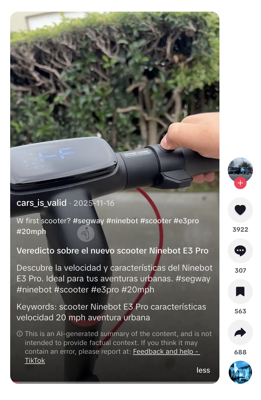总体来看,cars_is_valid 虽然粉丝规模不大,但凭借真实测评、细节展示和高质量互动,为 Segway-Ninebot 在英语和西班牙语用户群体中建立了较高信任度。这类兴趣型达人在品牌出海中往往扮演“社群种草者”的角色,通过真实体验与技术讨论,帮助品牌在细分爱好者圈层中逐步积累口碑。