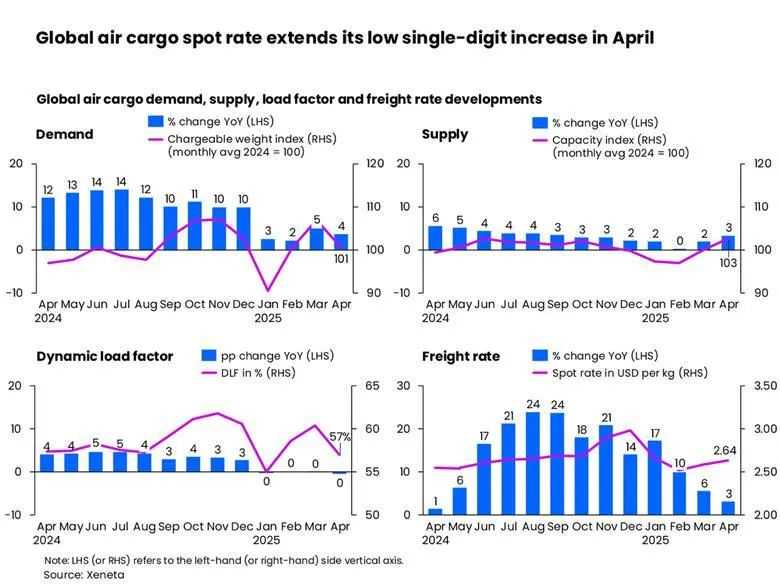 在需求疲软、关税紧张局势和航空燃油价格下跌的情况下,4 月份航空货运运价的改善幅度继续收窄。