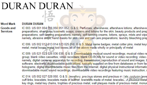 Duran Duran注册类目是03、06、09、14、16、21、25和41: