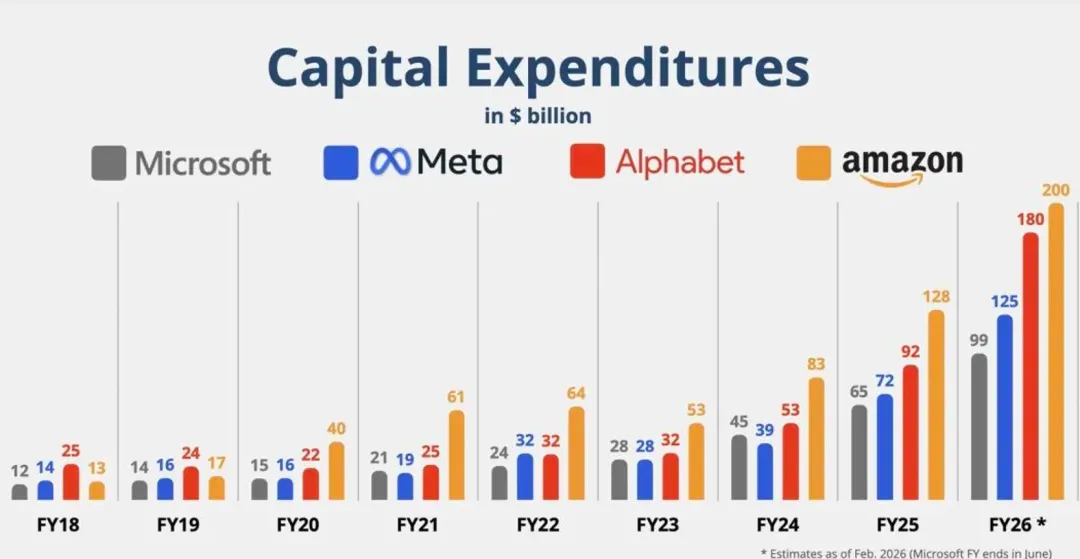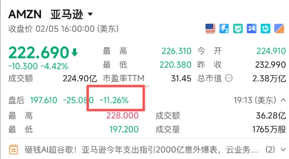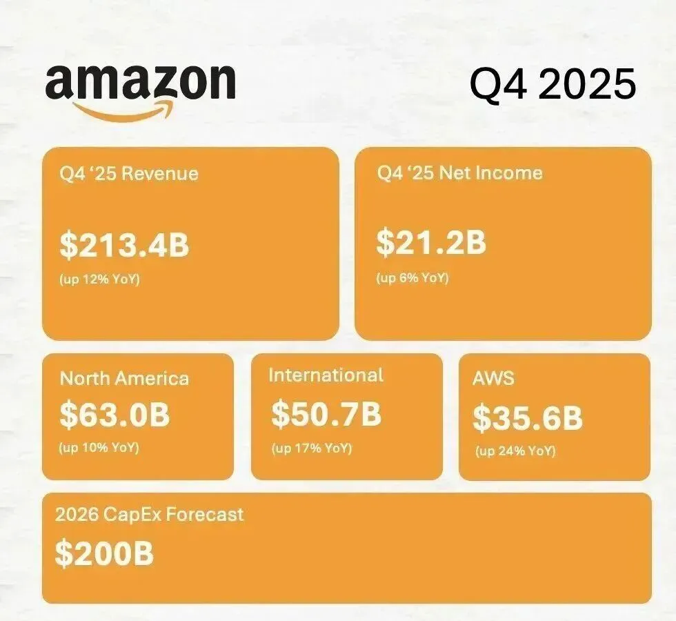 亚马逊财报会议上宣布,预计2026年的资本支出将达2000亿美元,成为本次股价暴跌的直接导火索;该数字远超分析师预估,更比2025年的支出跃升60%。