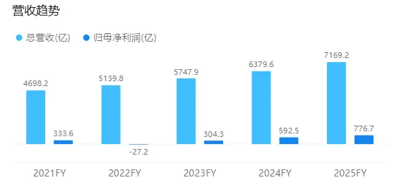 全年维度,公司总营收达7169亿美元,净利润从2024年的592亿美元升至776.7亿美元;