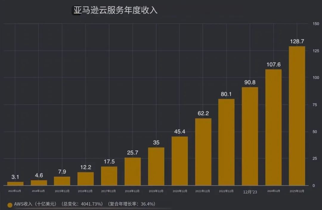 全年贡献收入1287亿美元,占公司总收入的18%,而营业利润占比却超过60%,已然成为亚马逊当之无愧的利润核心。
