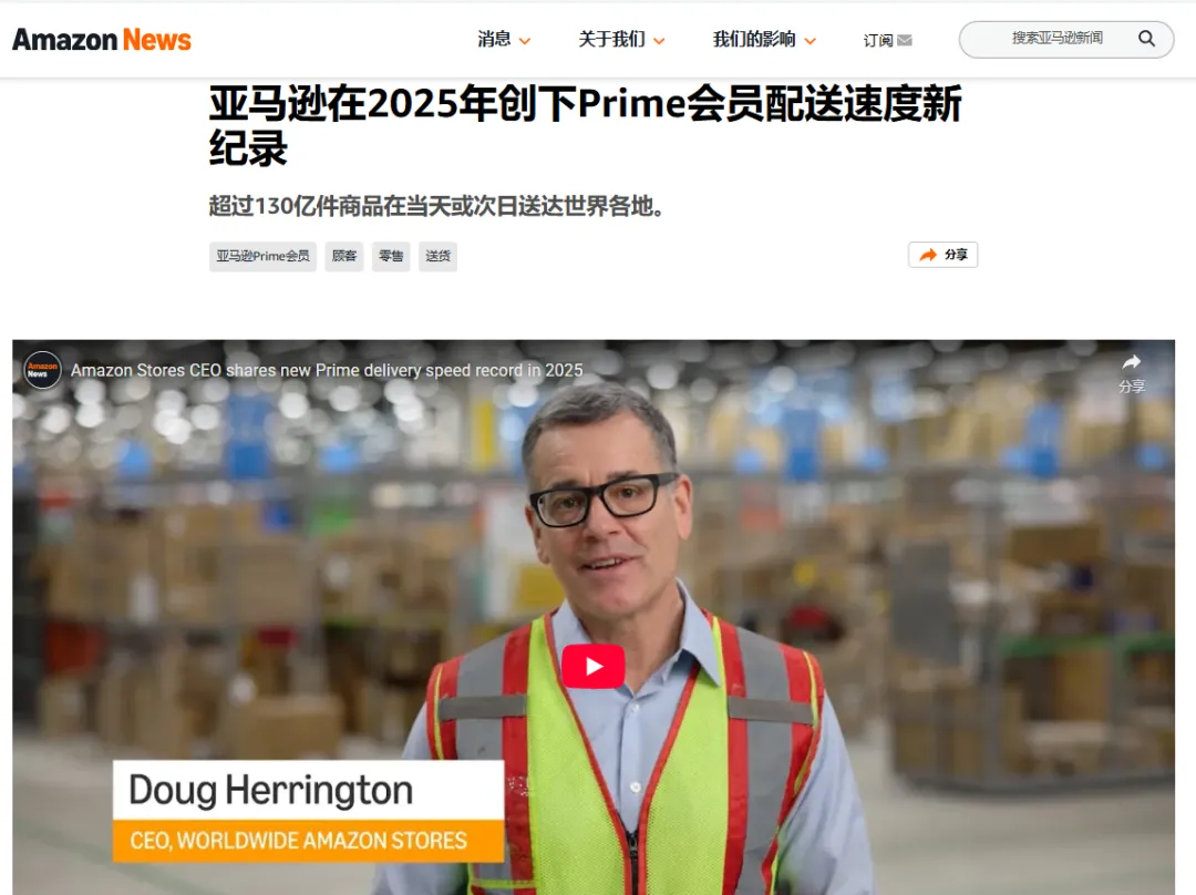 2025年亚马逊全球超过130亿件商品实现当日达或次日达,其中美国站超过80亿件,同比增加30%;