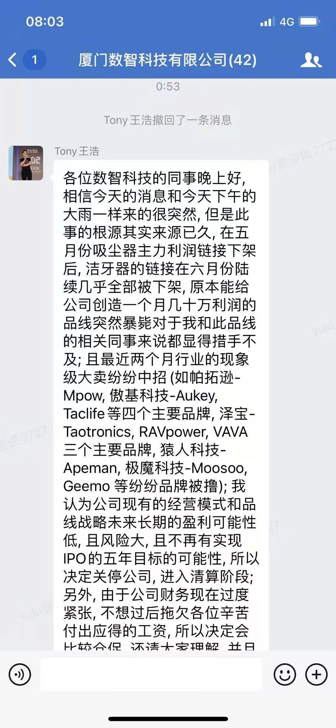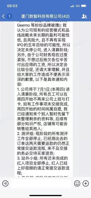 6月28日晚,厦门数智科技有限公司宣布从7月1日开始进入破产清算,所有员工可以在周四开始不再来公司上班与打卡。