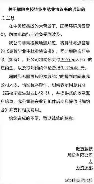 许多大卖家大规模裁员,其中首当其冲的就是应届毕业生,就像跨境圈流传出来的某公司关于解除高校毕业生就业协议的通知,从通知来看,该公司称中美贸易战以及国际环境已经影响到跨境电商行业,现解除与之前决定录用的毕业生签署的《高校毕业生就业协议书》,同时支付3000元赔偿。