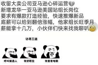 最近很火的一个招聘文案,“收留大卖公司亚马逊心碎运营。公司要新增深圳龙华亚马逊美国站组织岗位,要求有爆款打造经验,能快速推爆产品。”