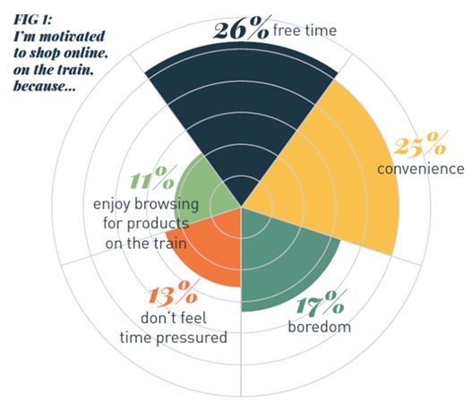 英国最大在线媒体公司KBH On-Train Media与英国市场分析公司Retail Economic合作进行的一项研究指出,英国每25欧元的在线零售支出中至少有1欧元来自乘坐火车出行的人们。总得来说,英国乘坐火车出行的人中有51%会在途中网购,而且其中有15%每周至少在火车上网购一次,人们平均每笔网购消费支出31.68欧元。