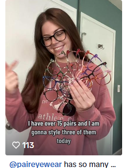 另一位博主 @rosiemaxhimer 则主打 “眼镜配色穿搭” 理念。她在视频中展示了如何根据Pair Eyewear磁吸顶盖的颜色来搭配同色系的衣服,巧妙呈现 “眼镜颜色与穿搭细节相呼应” 的搭配技巧。她介绍,只需一副基础镜框,就能从数百种磁吸顶盖中挑选,轻松实现每日风格的变换,而且这些眼镜还能满足老花镜、防蓝光镜等多种需求,同时她也提供了专属折扣码,助力用户购买。这种兼具实用性和种草属性的内容,大幅提升了 Pair Eyewear 销售转化效率。