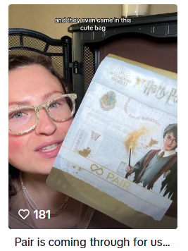 在与哈利波特联名系列上线时,博主 @tessanetting 发布了 “选择你的角色” 变装视频,视频中她随着音乐切换哈利波特里的不同角色,而 Pair 的哈利波特联名眼镜也会跟随角色变化相应的款式,这一创意视频获得了 13.3k 的点赞,进一步带动了该系列的传播热度。带动该系列首月狂卖 8 万件。