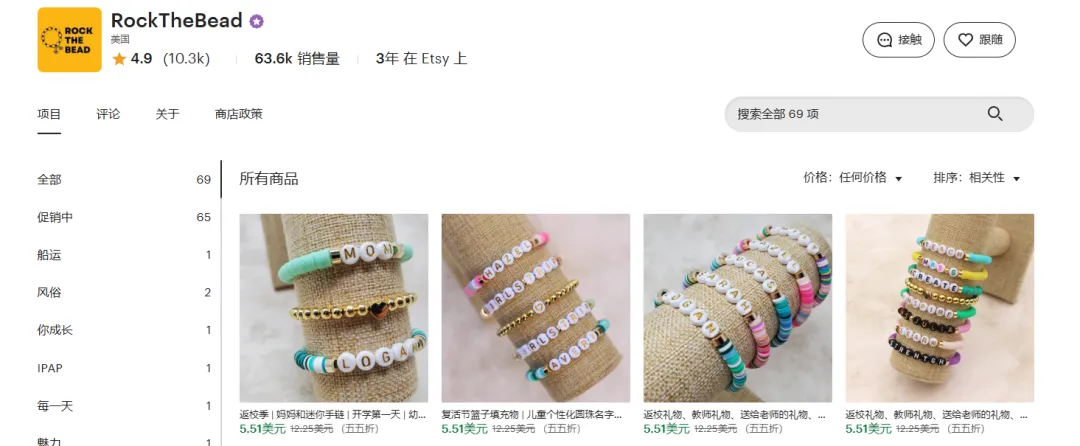 上面这家店铺在Etsy平台上做了3年,评分高达4.9分(有10.3k条评价),总销量63.6k件,一共69款商品,。主打个性化手链,比如返校季亲子款、复活节儿童款、基督教主题款,目前都是五五折促销,单个商品在7美元左右,受众覆盖儿童、学生、宝妈等各类人群。