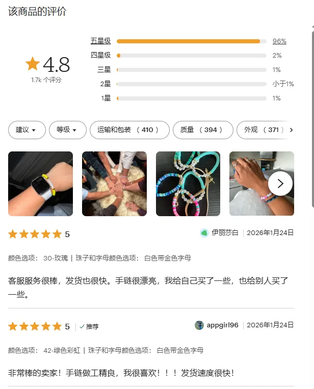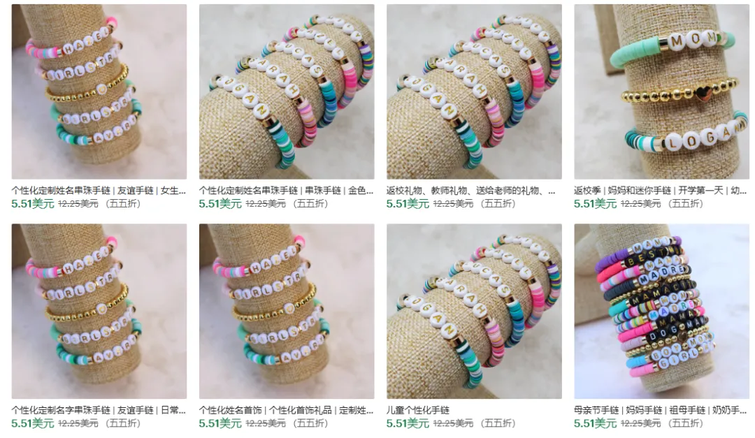 这家Etsy店铺的手链,每款都有明确的场景和情感定位——返校季送孩子、复活节当填充物、基督教信徒的信仰饰品、乳腺癌宣传的爱心款,不是单纯卖手链,是卖“适合特定场景的礼物”,再加上个性化定制(名字、字母),刚好戳中欧美消费者的需求,这也是它能做到高评分、高销量的关键。