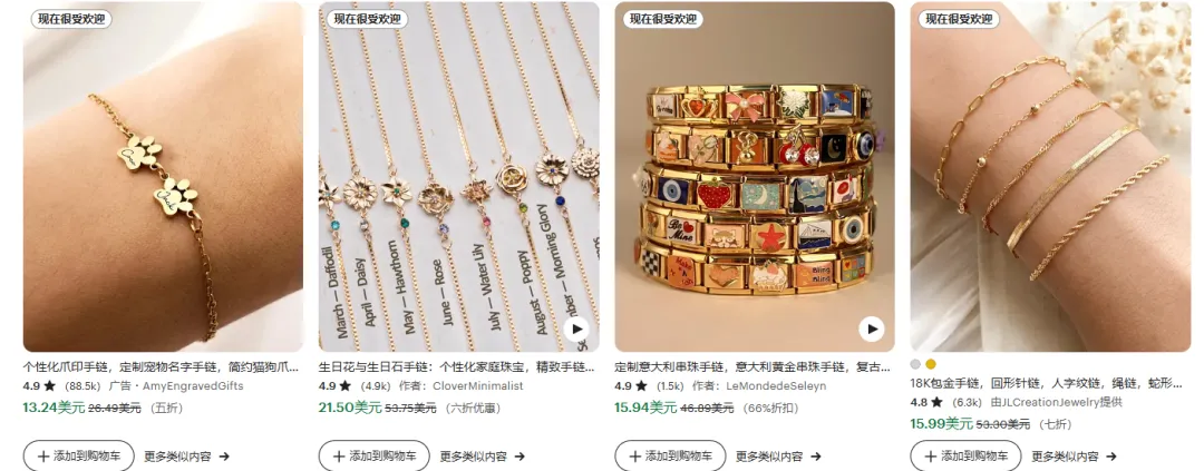 第一类,个性化饰品。比如案例里的手链、项链、耳环,成本低、易改造,而且欧美消费者很喜欢这类能体现自己个性的小饰品,定制需求也大,利润空间足。