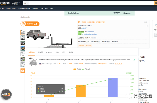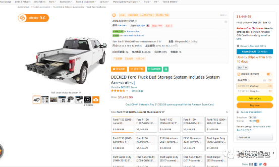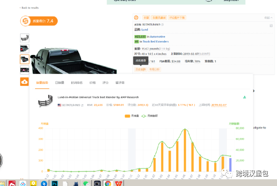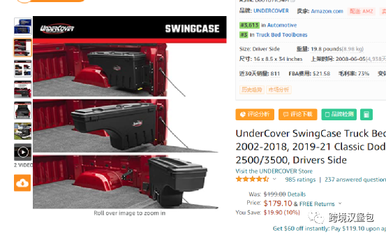 皮卡的配件主要分为两类:一种是辅助型,一种是收纳型。先说收纳型,皮卡工具箱,皮卡收纳箱,皮卡网兜。下面这个收纳箱,按照卖家精灵的数据一个月卖80个,再加上这样的客单价,一个月就大几十万人民币的业绩。不过我们也要看到,产品的包装尺寸是十分之大的,所以在做海外仓自配送的时候,要跟海外仓提前沟通好派送的费用,可以走的派送渠道(这点十分重要!)一定要提前确认好,我之前做英国站的时候就碰到过因为产品的体积过大只能走渠道B而不能走便宜并且靠谱一点的渠道A。从海外仓发货的尾程渠道,有时候因为你的产品超长了要收附加费用,有些因为超长不能发也有可能,所以大家一定要提前确认好。