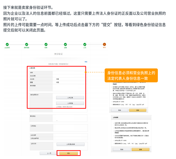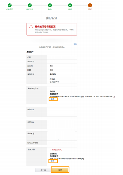在身份验证过程中,您若见到注册界面出现以下提示,则表示您提交的身份证和营业执照照片不符合要求,请您根据要求重新拍摄照片后再次提交。