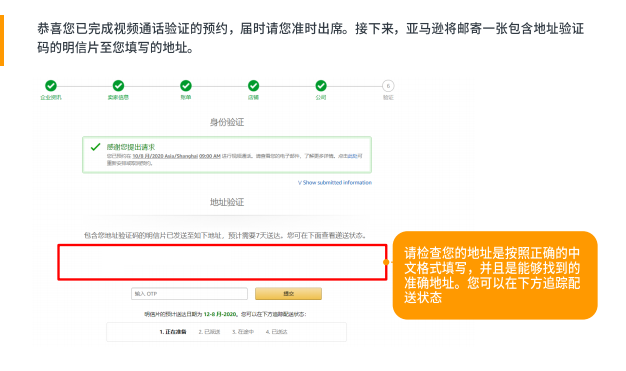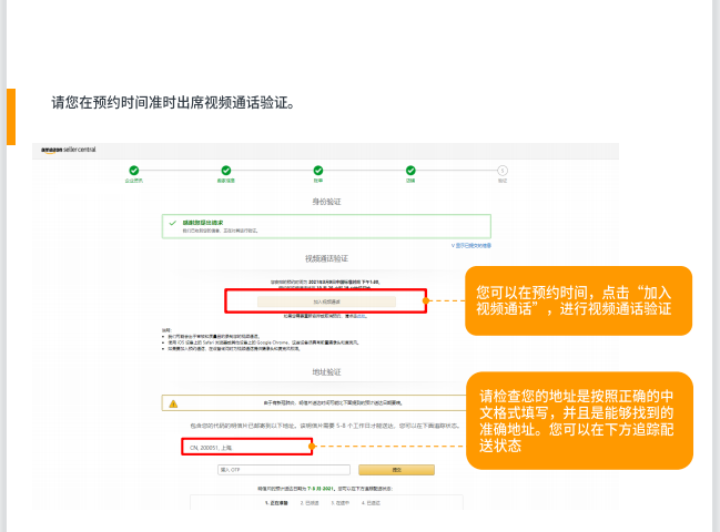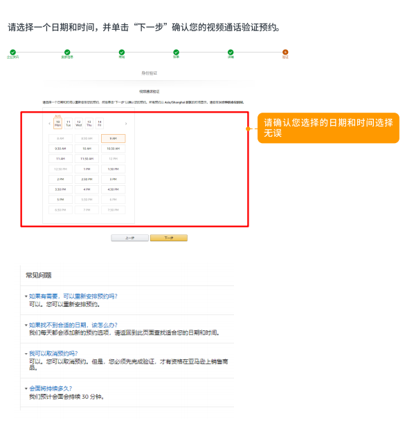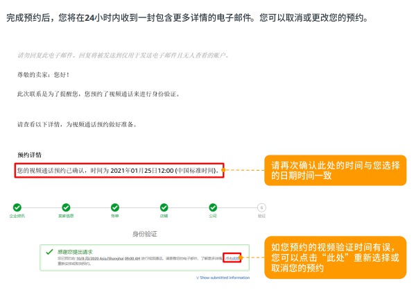 在视频验证过程中,您若错过原先预约时间而未出席,您的Seller Central界面将会查看到相应提示 (如截图)。请您重新预约新的时间,并准时出席。