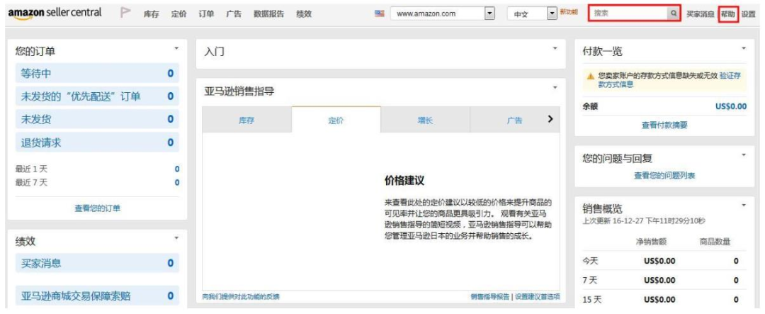 您可以点击右上角的搜索/帮助按钮,查找所有关于亚马逊北美站点卖家运营的信息。我们同时为 您准备了助您账户销售成功的信息指南,我们鼓励您学习了解。