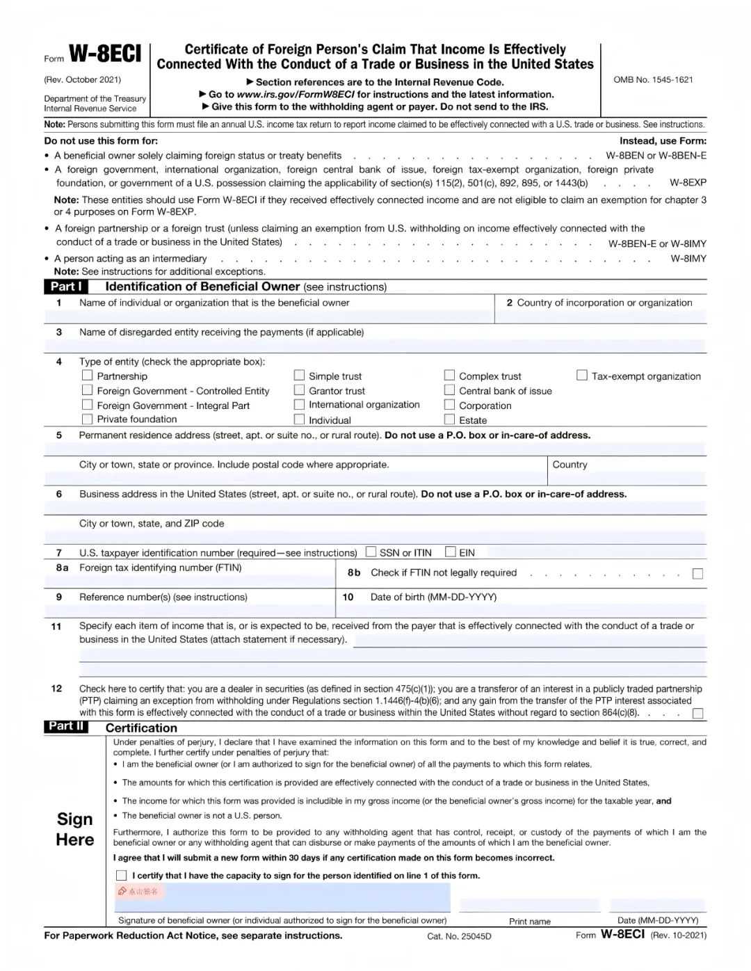 W-8ECI:由收款方填写提交给付款方,用于向 IRS 证明非美国实体或个人在美国境内从事的美国贸易或业务(USTOB)所产生的收入,和美国有实质性关系,从而能够适用于相关的税收待遇。