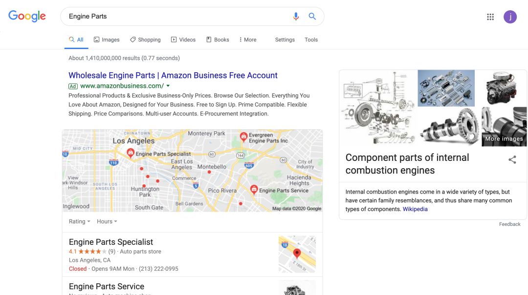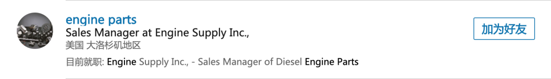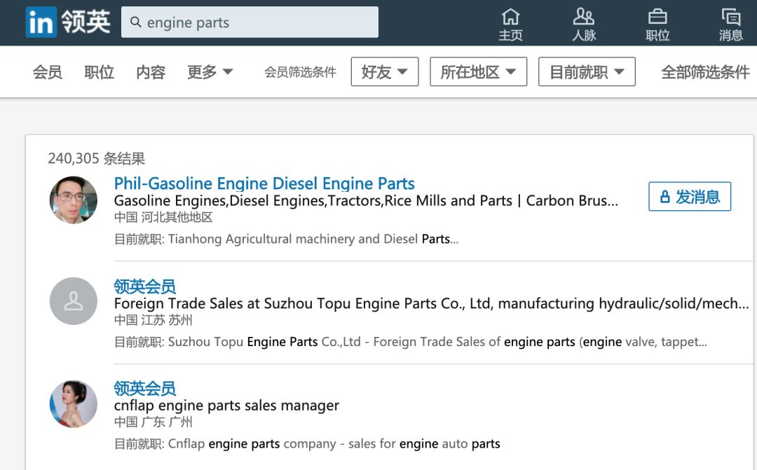 以领英为例,假设我所做的产品是登机箱,我们可以在搜索栏输入“engine part”,搜索结果会出现很多信息