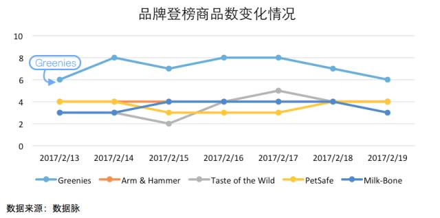 可以看到,在上周的 Best Seller 榜单中,宠物零食品牌 Greenies 依旧表现了出其品牌的榜单统治力,以一周内每日登榜商品数6款以上的稳定发挥,总登榜次数达50次,再次夺得品牌综合排名首位。