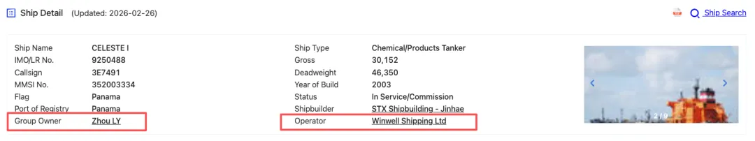 船舶所属公司包括:Zhou LY(中国)、Momeni A(阿联酋)、Mi-Das Line SA(巴拿马)、Iran Shipping Lines(伊朗)、Hafez Darya Arya Shipping Co(伊朗)等。