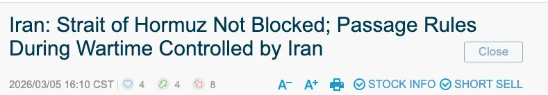 路透社援引业内人士消息称,当前仍有少量船只可正常通过海峡,而能够顺利通行的基本为中国籍或伊朗籍船舶。一名中东糖业高管透露,目前部分运糖船只已获得通行许可,其他船只则仍未获准放行。迪拜哈利勒糖业总经理 Jamal Al-Ghurair 也表示,确有个别船舶获批通过,但整体航运环境依旧紧张。