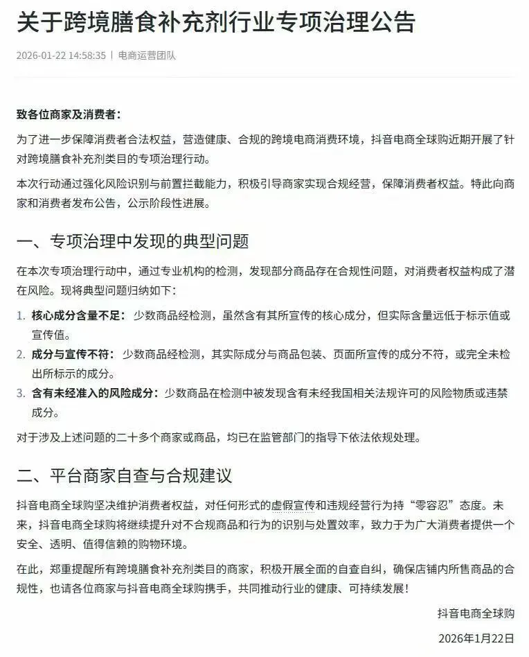 抖音电商全球购针对跨境膳食补充剂再出专项治理公告!