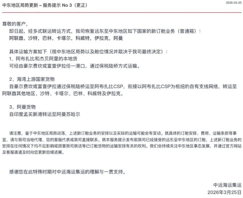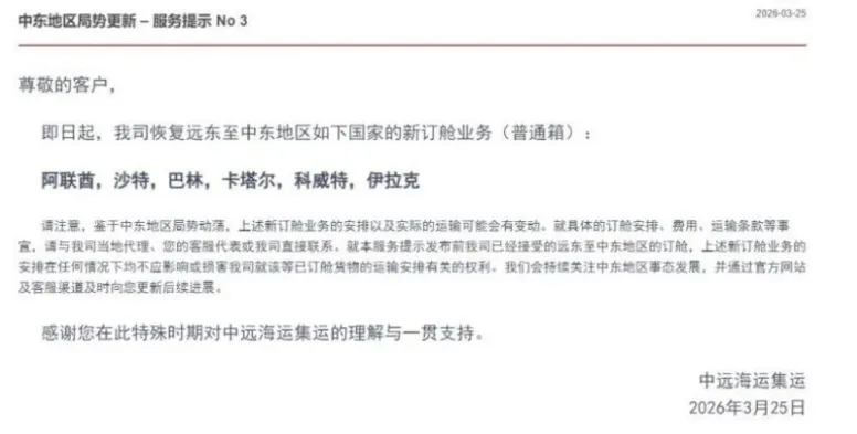 3月25日下午5点多,中远海运集运发布公告称,即日起,公司恢复至阿联酋、沙特、巴林、卡塔尔、科威特、伊拉克的新订舱业务(普通箱)。